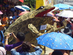 Each rocket ceremonies attending the parade. Is decorated beautifully. With patterns of Thai gold is said that the decorative arts of this rocket. Mr. Chang will be chopped and cut patterns. This is a time for months And then used glue stick to the ball rocket. Rocket is heading. Will create the images. Most popular image made mouth tongue serpent head spout water, it made some other form. It has a meaning to the myth of rain total. The rocket will be set on a pedestal. Driving a vehicle or wagon used the traditional parade.